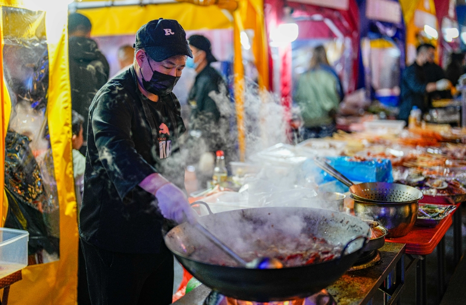 “我們?nèi)ゴ蚩ㄒ幌挛膭?chuàng)雪糕吧!”“咱烤幾串羊肉串吃吧!”“這個(gè)土火鍋看著就香!”5月4日,走進(jìn)豹街·西海路美食街,記者看到街區(qū)內(nèi)游客、市民絡(luò)繹不絕。街區(qū)劃分出啤酒燒烤、青海特色美食、文創(chuàng)產(chǎn)品等板塊,不僅有土火鍋、酸奶、釀皮、尕面片等具有地方特色的美食,還有頗受年輕人喜愛的“網(wǎng)紅”小吃和文創(chuàng)產(chǎn)品,每個(gè)攤位前都擠滿了前來(lái)選購(gòu)的市民。市民游客或手捧奶茶穿梭著尋覓美食,或領(lǐng)著家人孩子觀看表演、或用手機(jī)拍照打卡記錄、或圍坐在桌邊現(xiàn)場(chǎng)享受美食……市民游客在這里嘗美食、品民俗、賞風(fēng)景,整條街充滿著濃濃煙火氣。