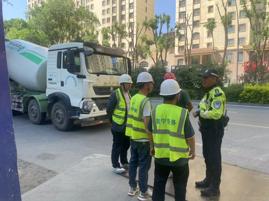 △交警進(jìn)工地,講解交通安全常識(shí),為駕駛?cè)松暇o“安全弦”。