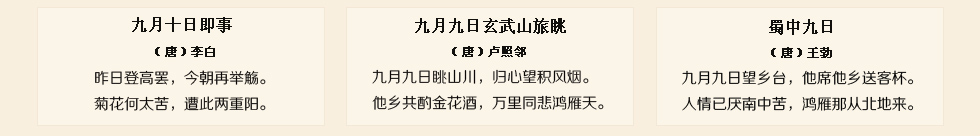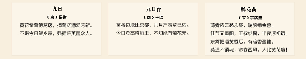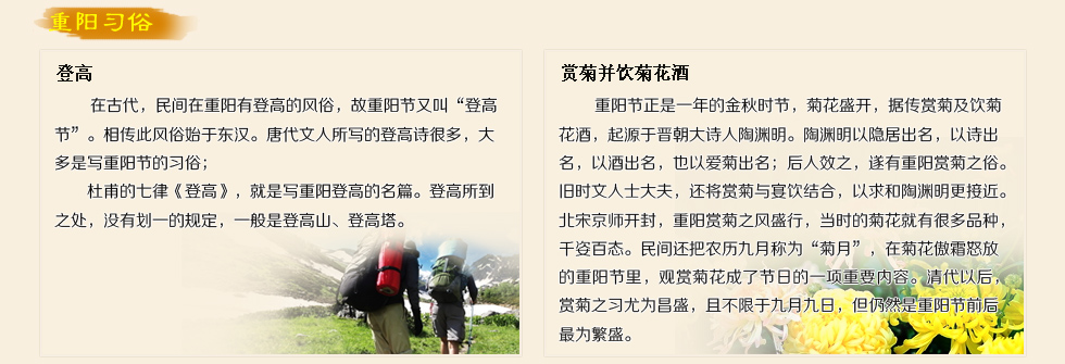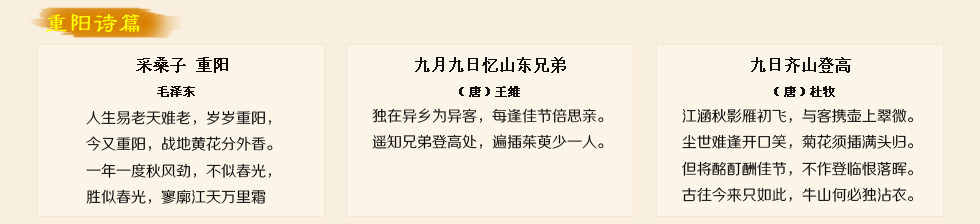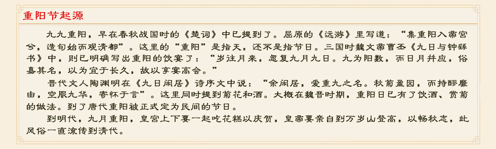 重陽節(jié)又稱“踏秋”,每年農(nóng)歷九月初九日,為中國傳統(tǒng)四大祭祖的節(jié)日 。重陽節(jié)早在戰(zhàn)國時期就已經(jīng)形成,到了唐代,重陽被正式定為民間的節(jié)日,此后歷朝歷代沿襲至今。重陽與三月初三日“踏春”皆是家族傾室而出,重陽這天所有親人都要一起登高“避災(zāi)”,插茱萸、賞菊花。