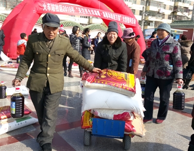 圖為困難群眾在慰問現(xiàn)場滿載而歸
